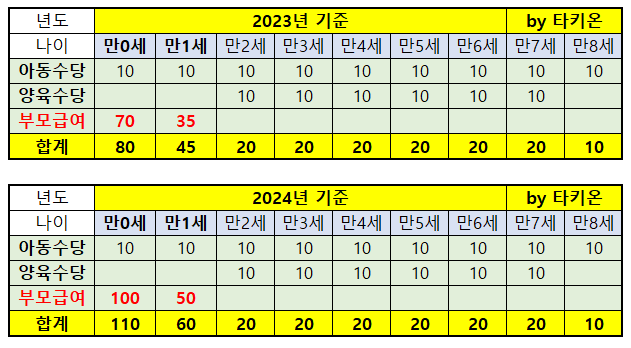 ● 아동수당법 시행령 개정에 따라 2023년 9월 5일 기준 아동에게 지급되는 부모급여가 2024년 1월 1일부터 연령에 따라 금액이 상향조정됩니다. 만 0세는 현재 월 70만 원에서 월 100만 원으로, 만 1세는 월 35만 원에서 월 50만 원으로 각각 상향 지원합니다(아래 표 참조).